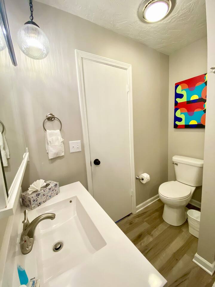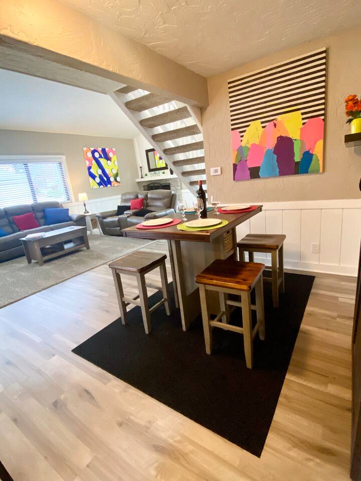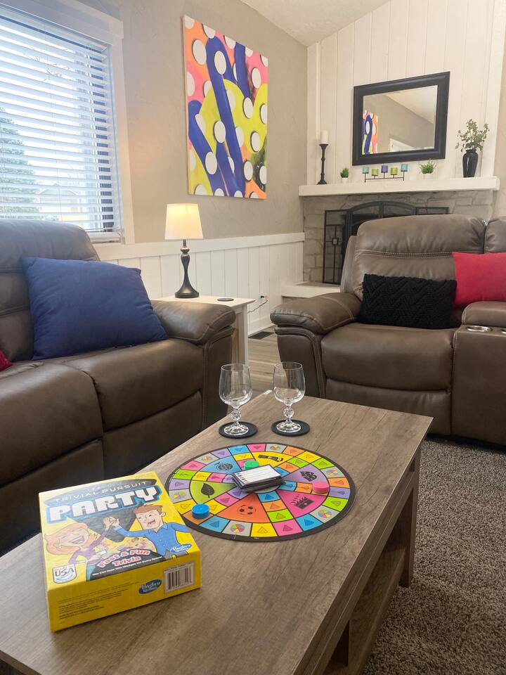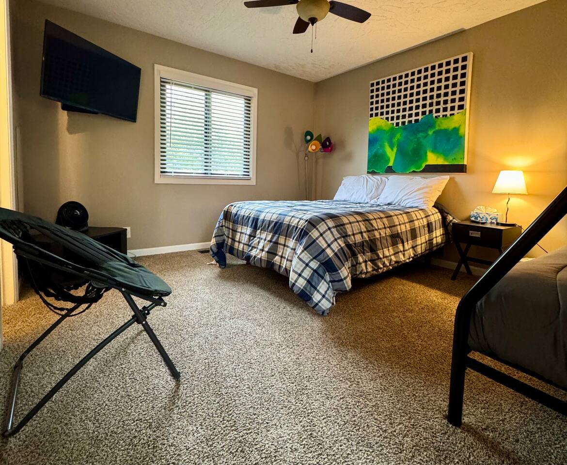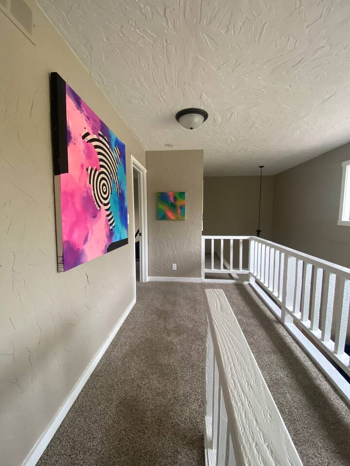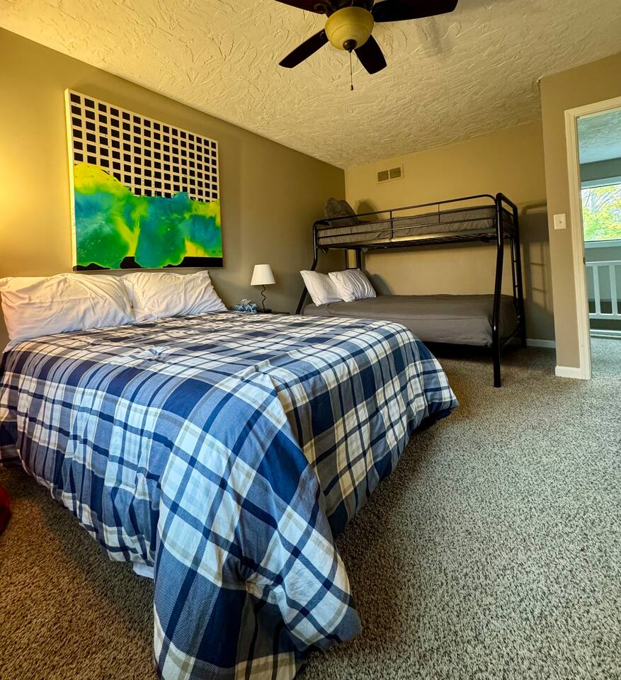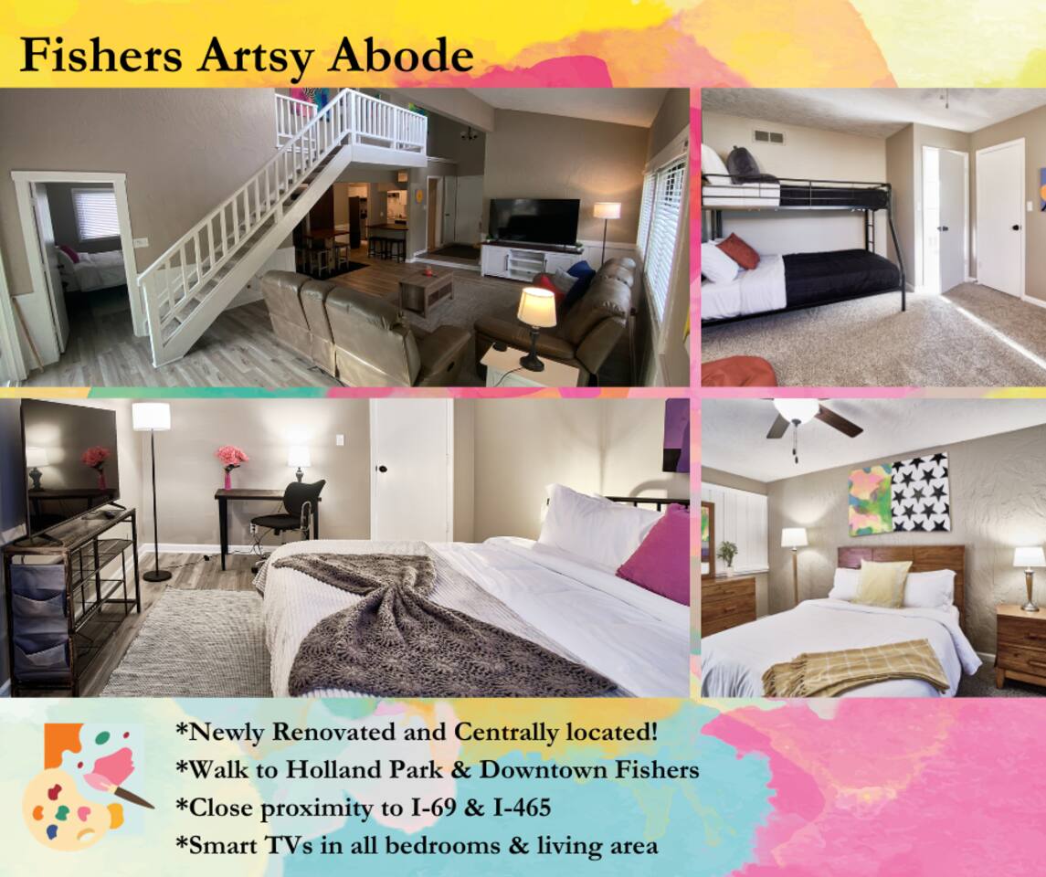 đ¨ The Artsy Abode â Family-Friendly Comfort in the Heart of Fishers! Welcome to your vibrant home away from home, where comfort meets creativity! This newly renovated and artfully styled retreat showcases original works by local artist Riley Sims, all available for purchase during your stay. đď¸ Bedrooms & Sleeping Arrangements Bedroom 1: King bed, main-level master with Smart TV Bedroom 2: Queen bed with Smart TV Bedroom 3: Twin-over-full bunk bed with Smart TV Additional: Queen air mattress available upon request Sleeps 7â9 guests comfortably đ Bathrooms Two full bathrooms: one with a tub/shower combo, one with a walk-in shower đł Kitchen & Dining A modern, well-equipped kitchen with a brand-new refrigerator, Keurig & drip coffee makers, and everything you need to cook at home. Laundry room includes an LG washer/dryer tower for convenience. đď¸ Living & Entertainment Relax in the cozy living room with a leather reclining sofa and loveseat, and a 65â Smart TV. Have fun with the arcade game, foosball table, and board gamesâperfect for family nights! The garage includes an extra fridge, coolers, a TV with local channels, and folding chairs for flexible use. đ¨ Local Art On Display Art throughout the home is by Fishers-based artist Riley Sims and available for purchase. đ Location Highlights Centrally located near some of Fishersâ top attractions: Top Golf â 9 min Fishers Event Center â 9 min Conner Prairie â 5 min IKEA â 9 min Ruoff Music Center â 16 min Hamilton Town Center â 15 min Grand Park Sports Campus â 24 min Enjoy walkable access to Nickel Plate District, with boutiques, coffee shops, local dining, and Holland Park just minutes away. đŹ What Guests Love â âSpotless, cozy, and full of thoughtful touches. The art is incredible!â â âPerfect for familiesâfelt like a home away from home.â â âStylish, comfortable, and an unbeatable location.â đ˝ď¸ Local Dining Favorites Roost â Coffee cake & hash brown casserole Chatham Tap â Famous Angel Wings & fish and chips Parkâs Place Pub â Great wraps, burgers, and tenderloins Bento CafĂŠ â Sushi & pork gyoza Rockstone Pizza â Cozy pizza spot nearby Ale Emporium â Deep dish pizza, wings, and the best breadsticks in town Experience art, comfort, and convenienceâall in one stay. Whether youâre here for family fun, a weekend getaway, or a local event, the Artsy Abode offers the perfect Fishers retreat!